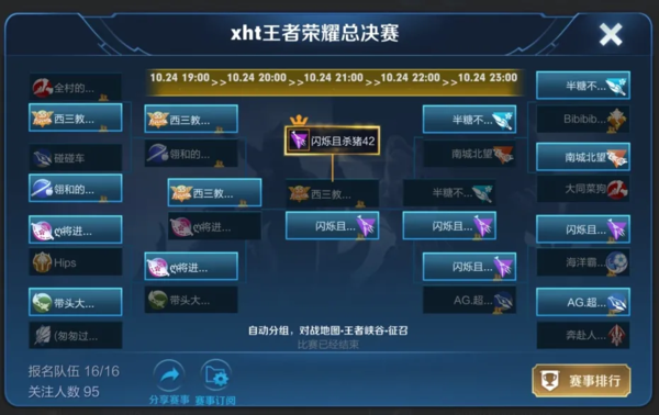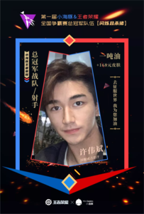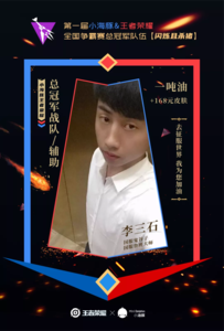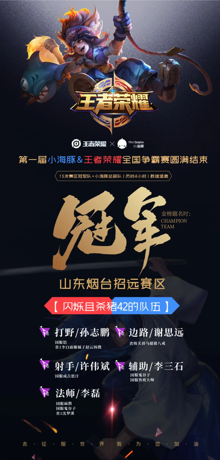 小海豚&王者荣耀 第一届全国争霸赛 我来自哪里,就捍卫哪里; 我去到哪里,就征服哪里! 从10月19日开始,大赛进行线上征集, 全国十五个赛区共集结上百只队伍进行海选赛。每个赛区的冠军除获得进入总决赛的资格外,每人还获得了100元无门槛汽油券。 10月24日, 总决赛现场15支赛区冠军队+小海豚公司队 经过近4个小时的激烈厮杀, 小海豚&王者荣耀第一届全国争霸赛完美落幕! 恭喜烟台招远赛区-【闪烁且杀猪42的队伍】获得总冠军!荣获一吨汽油大奖! 河北石秦赛区-【西三教力量】获得亚军!荣获半吨汽油奖励。